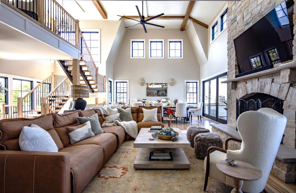 The living room was designed for entertaining with plentiful seating and a wood-burning, floor-to-ceiling stone fireplace. “Nothing feels better than a real fire to cozy up on the couch,” Barbara Stella says.
