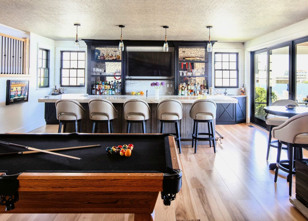Just outside the sliders of the game room is a waterside deck with a pool behind. A roomy sectional is convenient when the family entertains, as are a 12-person bar and a pizza oven. The space works for a quiet weekend of relaxing as well as for hosting summer parties and fall football feasts.