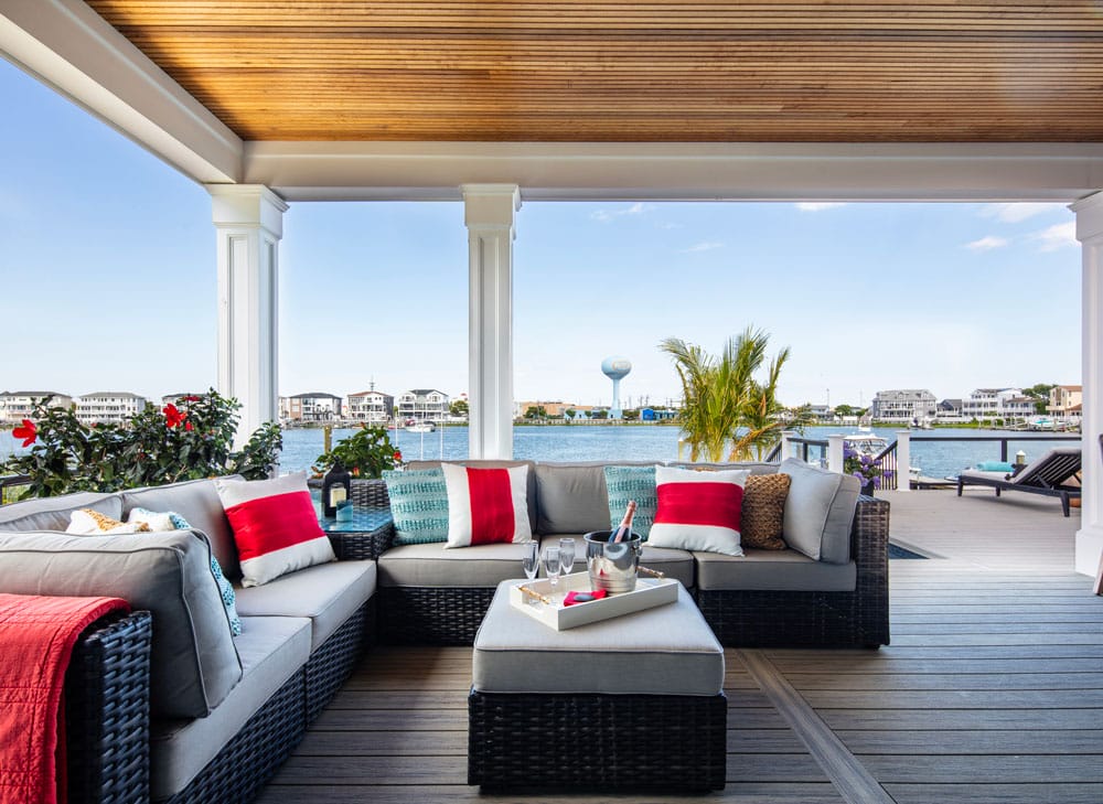 Sliders lead from the game room to the waterside deck when it’s time to enjoy the outdoors. The deck includes a roomy sectional, lounge chairs and, not seen in the photo, a 12-person bar and a pizza oven.