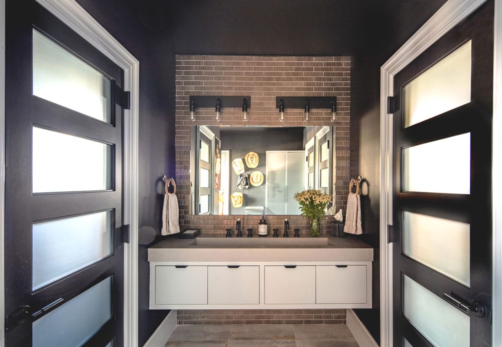 Conveniently located near the game room and deck is a men’s bathroom, women’s bathroom and changing room. “This is a speed boaters’ house with a lot of people who get off the boat and come in to shower and change,” Sheroda explains. The men’s bathroom (pictured) is designed with commercial flair and features a custom vanity with concrete trough sink.