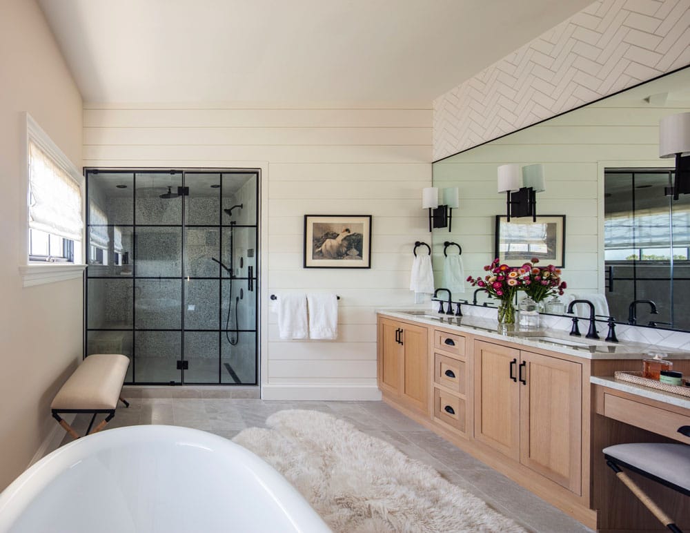 The primary bathroom, meanwhile, is elegantly chic. “The Stellas didn’t want the average white-with-gray-veining marble bathroom, so we went with an off-white, creamier porcelain with black accents,” Sheroda says. They also requested a big shower, a television viewable from the bathtub and an overall sophisticated matte look. The walls are covered in shiplap and subway tile installed in a herringbone pattern. The owners love the result. “We do love our bedroom/ bath area,” Barbara Stella says. “We feel like it is a sanctuary.”