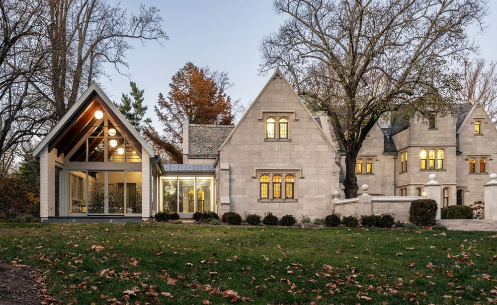 Initially, the homeowners hired Mills + Schnoering Architects of Princeton to restore the exterior, preserve original interior elements and undertake some interior renovations. Later, they commissioned the team to add an extension to accommodate an indoor pool.