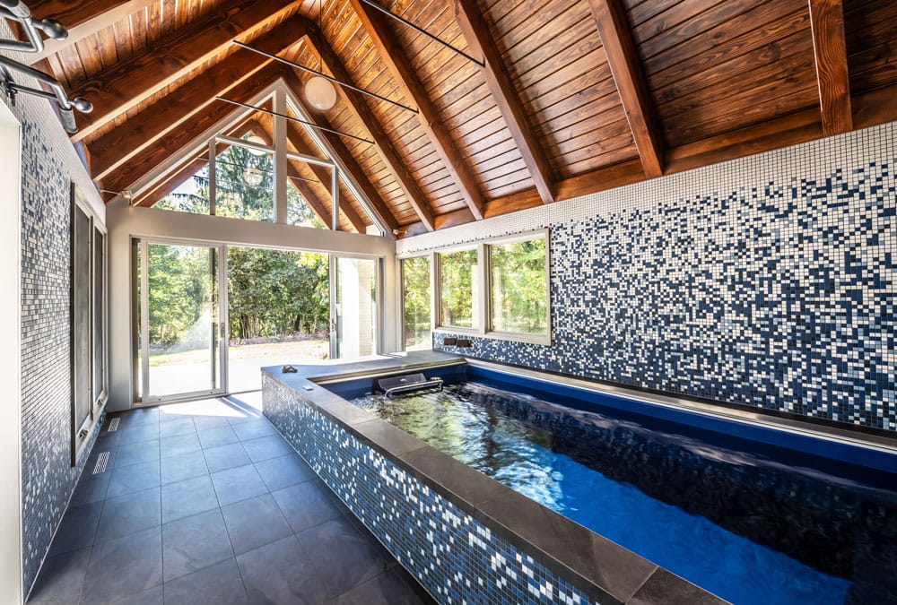 “For years, my husband had dreamed of having an Endless Pool,” the owner recalls. “In fact, he bought it from the manufacturer years ago, but we hadn’t had an opportunity to install it.” The design of the addition was a collaborative effort between the architectural team and the homeowners. “They know the house well and did a great job imagining something modern yet very much in the idiom of the original house.”